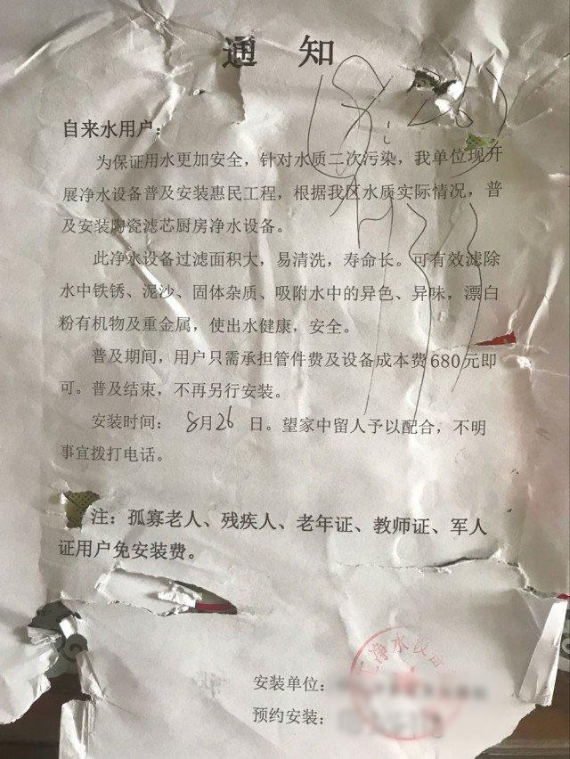 李女士說,今年的8月26號早上,她發(fā)現(xiàn)家門口多了一張通知。上面寫道:開展凈水設(shè)備普及安裝惠民工程,普及安全凈水設(shè)備。沒過多久,便有一個自稱是某凈水設(shè)備安裝處的工作人員上了門。