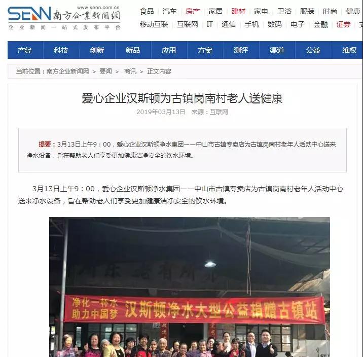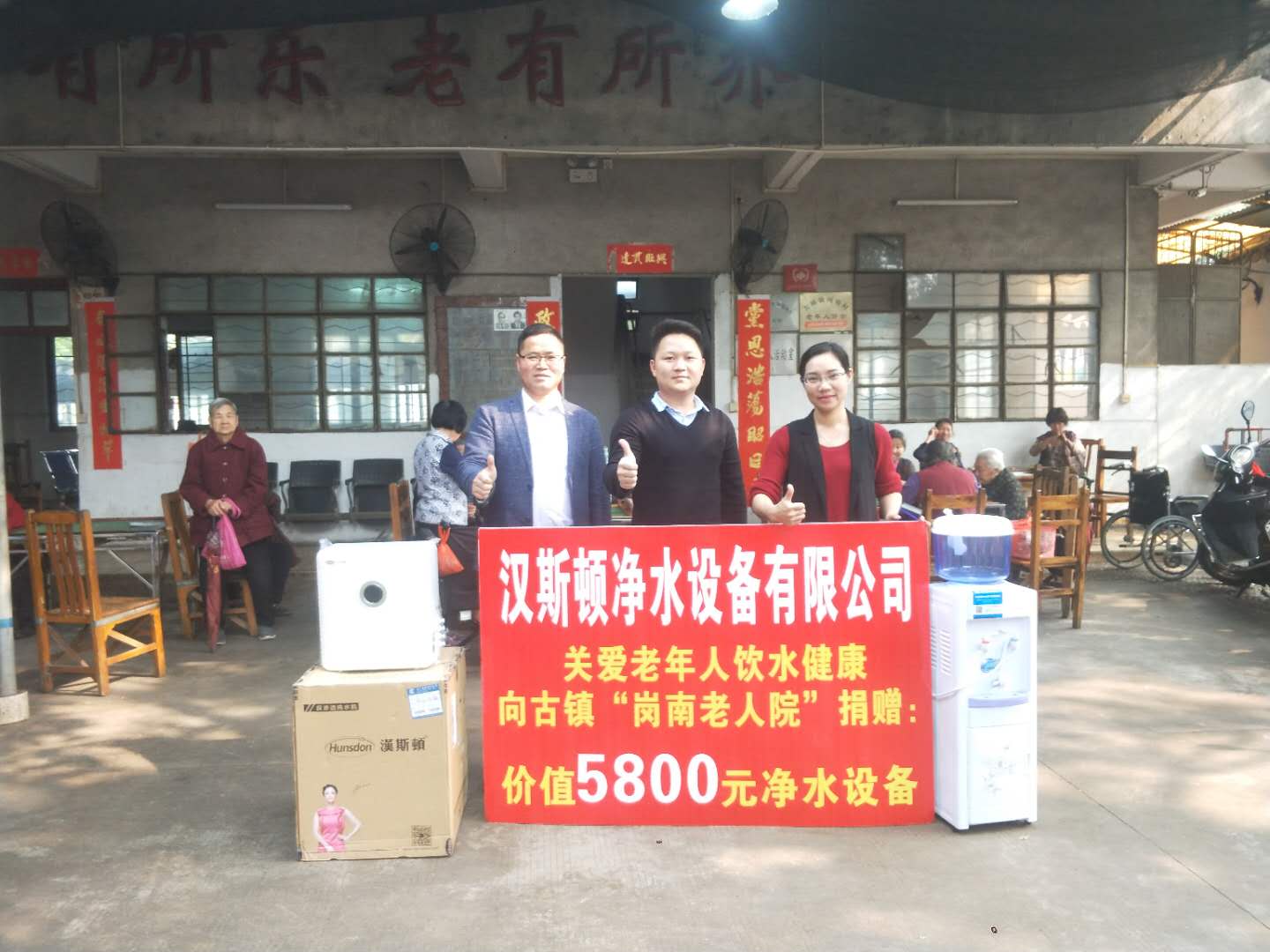 2019年3月,漢斯頓集團(tuán)攜手廣東省中山市古鎮(zhèn)鎮(zhèn)崗南村村委,在老年人活動(dòng)中心開展“凈化一杯水 助力中國夢”活動(dòng),為老人們送來暖心又健康的凈水產(chǎn)品及其他慰問品,祝愿他們可以享受健康的飲水生活。
