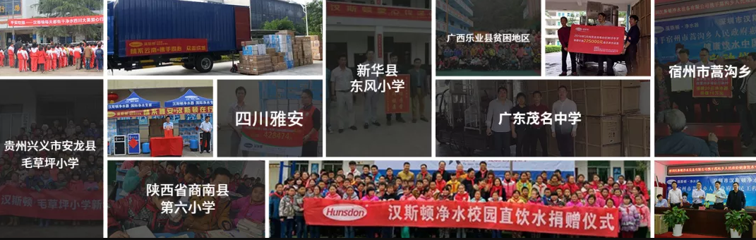 2015年12月,漢斯頓走進(jìn)陜西省商南縣第六小學(xué)和商南縣第三幼兒園,開展“以愛凈水”公益活動(dòng),為學(xué)校捐贈(zèng)凈水設(shè)備,幫助貧困地區(qū)的學(xué)校解決飲水安全隱患和提升學(xué)校師生的公共安全意識,保障師生們的飲水安全。