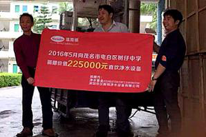 2016年6月,漢斯頓凈水器和美國基金會,聯(lián)合發(fā)起的“以愛凈水”公益項(xiàng)目,向茂名市電白區(qū)樹仔中學(xué)捐贈(zèng)價(jià)格22.5萬元的全套凈水設(shè)備正式使用。該活動(dòng)得到了政府、學(xué)校領(lǐng)導(dǎo)、學(xué)生的支持和贊揚(yáng),在當(dāng)?shù)匾鸩恍〉姆错憽?/span>