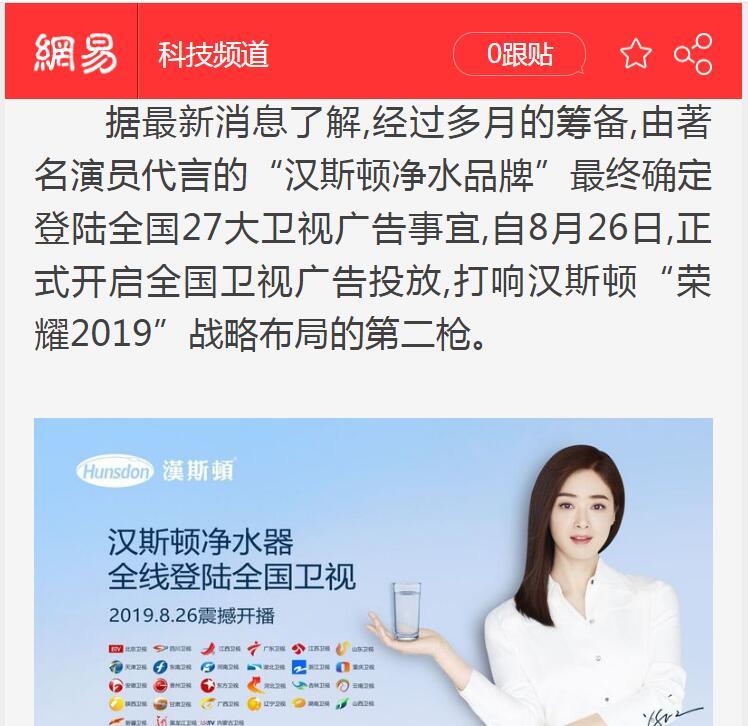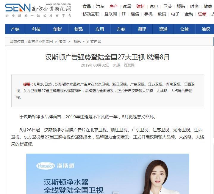 對漢斯頓品牌來講,2019年,注定是瘋狂的一年,是不平凡的一年,而8月更是意義非凡。「漢斯頓“榮耀2019」戰(zhàn)略布局的第二槍開啟了。8月26日起,漢斯頓凈水品牌廣告片在北京衛(wèi)視、浙江衛(wèi)視、廣東衛(wèi)視、江蘇衛(wèi)視、湖南衛(wèi)視、江西衛(wèi)視、東方衛(wèi)視等27省王牌電視臺強勢播出,品牌魅力全面爆發(fā),高頻次亮相,強勁品牌推廣,敬請期待!