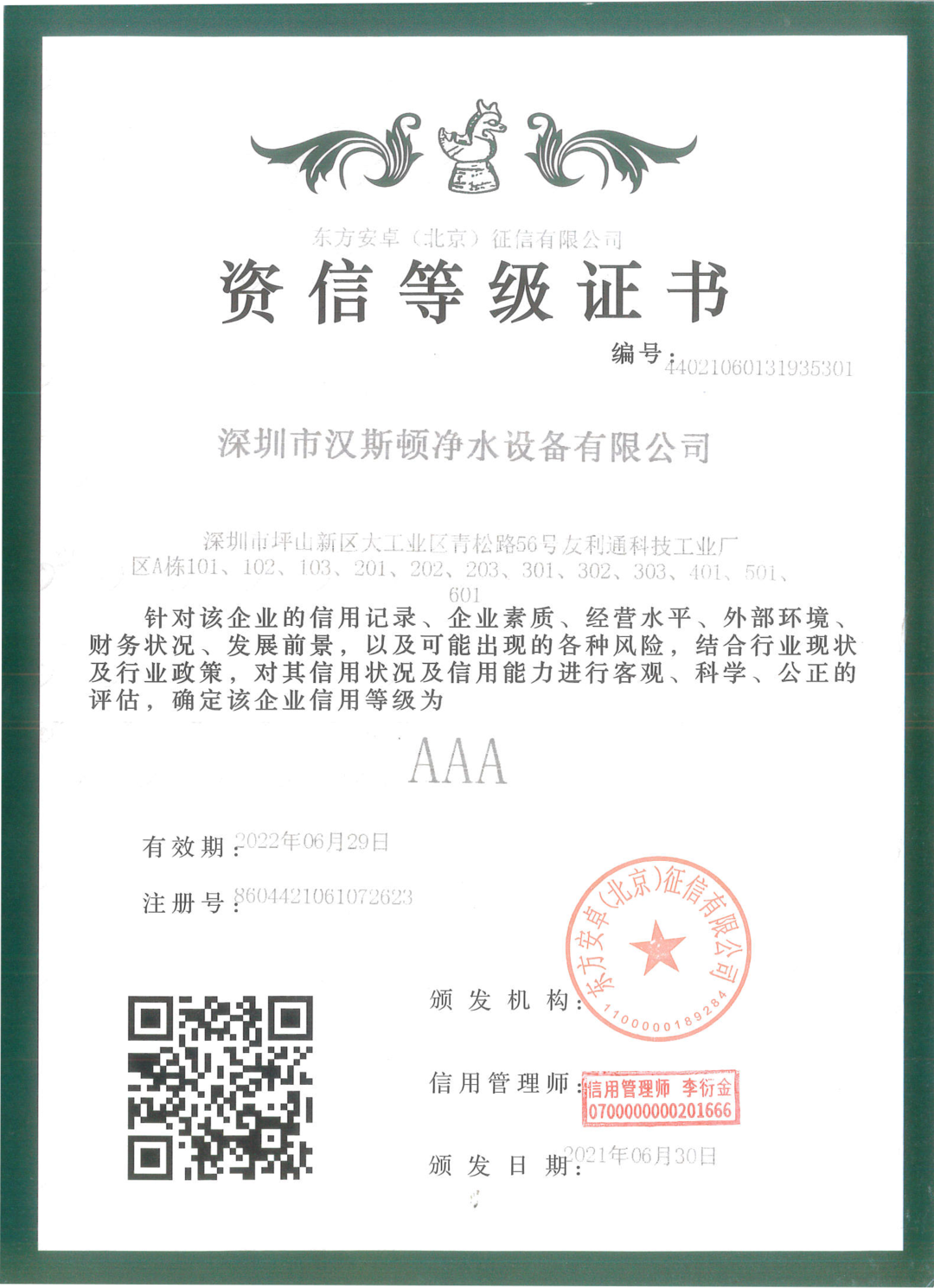 漢斯頓專注凈水領域多年,一直秉承”質(zhì)量與技術并行,責任和義務共擔“的態(tài)度,多年來斬獲碩果累累。特別是2020年疫情爆發(fā)后,企業(yè)發(fā)展環(huán)境備受影響,漢斯頓集團依然砥礪前行,穩(wěn)中求進,在產(chǎn)品技術突破、新品研發(fā)、社會公益、企業(yè)合作等方面都取得不俗成果,為本次斬獲AAA級評定奠定了堅實基礎。